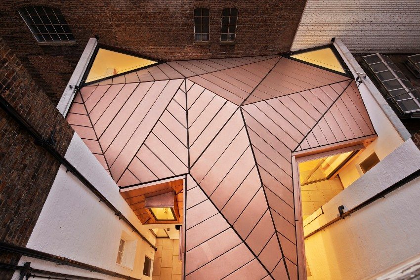 Jubin kepingan tembaga mempunyai penampilan yang indah dan mulia. Lama kelamaan, ciri plak bahan mentah ini terbentuk di permukaan bahan dalam bentuk patina kehijauan. Tetapi ia tidak mengurangkan sifat hiasan lapisan, tetapi, sebaliknya, menekankannya.