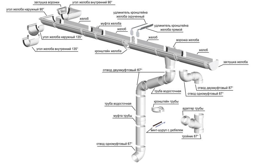 Tidak kira apa bahan yang terdiri dari sistem saliran, ia merangkumi beberapa elemen, yang masing-masing mempunyai tujuannya sendiri dan sesuai dengan keadaan di mana ia digunakan. Secara ringkas, bahagian penyusun dapat disenaraikan seperti berikut: