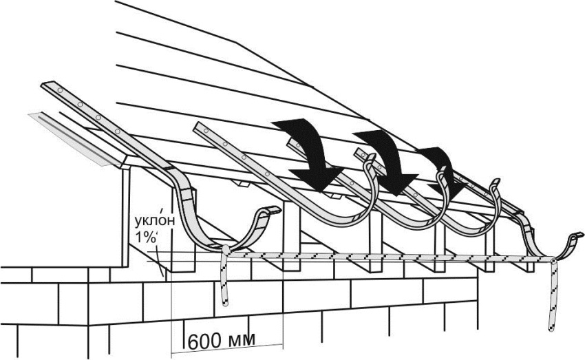 Untuk pemasangan sendiri, cara termudah adalah menggunakan jenis struktur yang digantung, yang menyediakan pengikat saluran ke cangkuk khas yang terletak di sepanjang atap. Pilihan ini lebih baik, kerana selokan dinding, yang digunakan pada atap jahitan berdiri, adalah tugas profesional yang menutupi atap rumah.