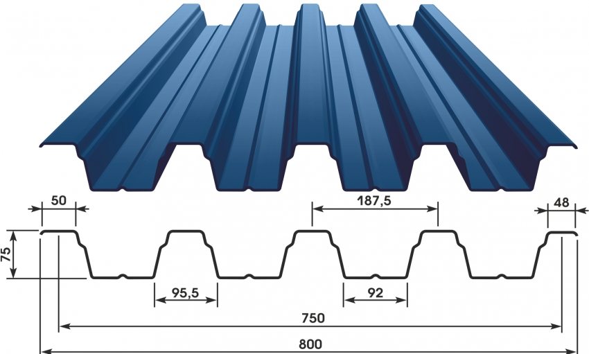 H75 - salah satu pilihan bumbung paling tahan lama dan boleh dipercayai dengan ketinggian profil maksimum. Alat ini dapat digunakan di atap dengan lathing pitch hingga 4,5 m. Dengan harga lembaran yang agak tinggi, ukuran lembaran atap jenis ini panjangnya 14,5 m, dan lebar keseluruhan dan berguna helai masing-masing 0,8 dan 0,75 m.