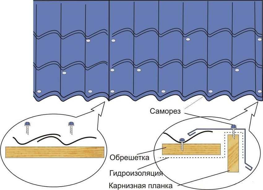 Lembaran jubin logam dengan ukuran standard mesti diletakkan dengan tumpang tindih 10 cm.Jika panjang cerun melebihi 6-7 m, maka kepingan itu harus dipecah menjadi 2-3 bahagian.
