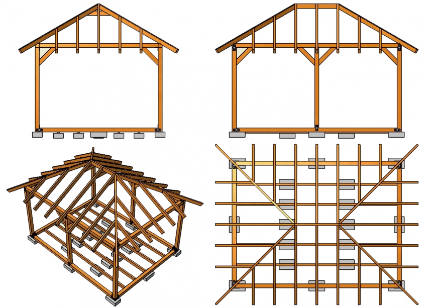 Berdasarkan gambar, elemen yang diperlukan disiapkan dan kemudian dipasang. Peranti bumbung pinggul untuk gazebo terdiri daripada tindakan berurutan berikut:
