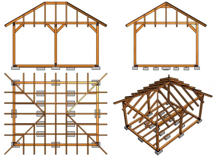- di sudut struktur, tiang dengan pendirian menegak dipasang secara menyerong, yang akan berfungsi sebagai sokongan tambahan untuk kasau. Sprengel dipasang ke Mauerlat;