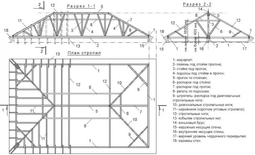 - ketinggian bumbung pinggul boleh menjadi apa-apa, namun, jika cerun sangat tidak penting, anda harus menggunakan rak sokongan tambahan;