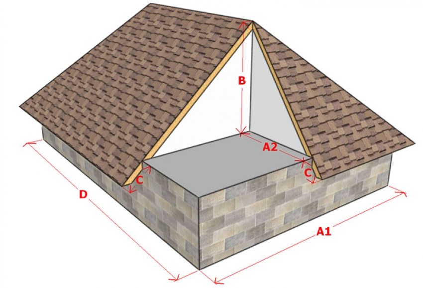 Projek bumbung pinggul, di mana A1 - lebar dasar, A2 - lebar pondasi, B - tinggi kenaikan, C - panjang overhang, D - panjang dasar