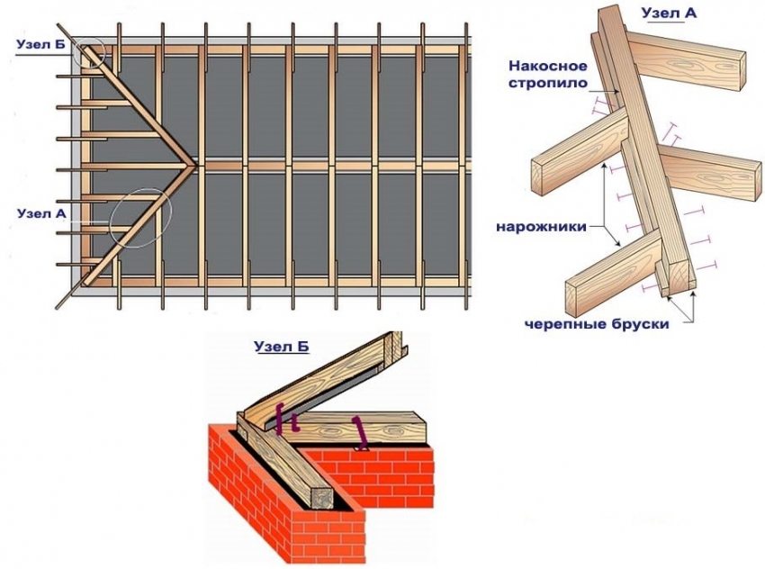 - fiksasi kasau pendek dilakukan bukan pada gelungan rabung, tetapi pada elemen puting. Sudut kecondongan kaki kasau pendek dan pertengahan bertepatan;