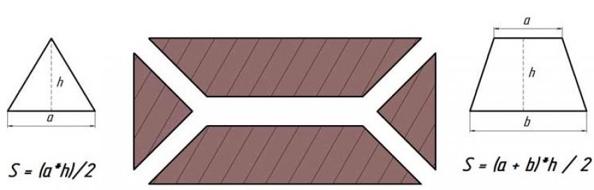 Contohnya, anda boleh mengira luas bumbung yang berpinggul. Dengan lukisan bumbung, pengiraan lebih mudah dan nilai yang diperlukan akan lebih tepat. Gambar rajah menunjukkan bahawa pangkalan untuk bumbung adalah segi empat tepat, dua lereng adalah segitiga isoskel, dua lagi adalah trapezoid.