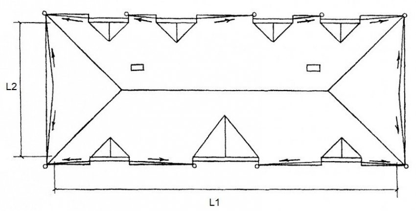 Nasihat berguna! Sekiranya bahan gulung atau jubin logam akan digunakan untuk penutup, ketika menentukan luas permukaan, perlu mengurangkan panjang cerun bumbung sebanyak 70 cm.