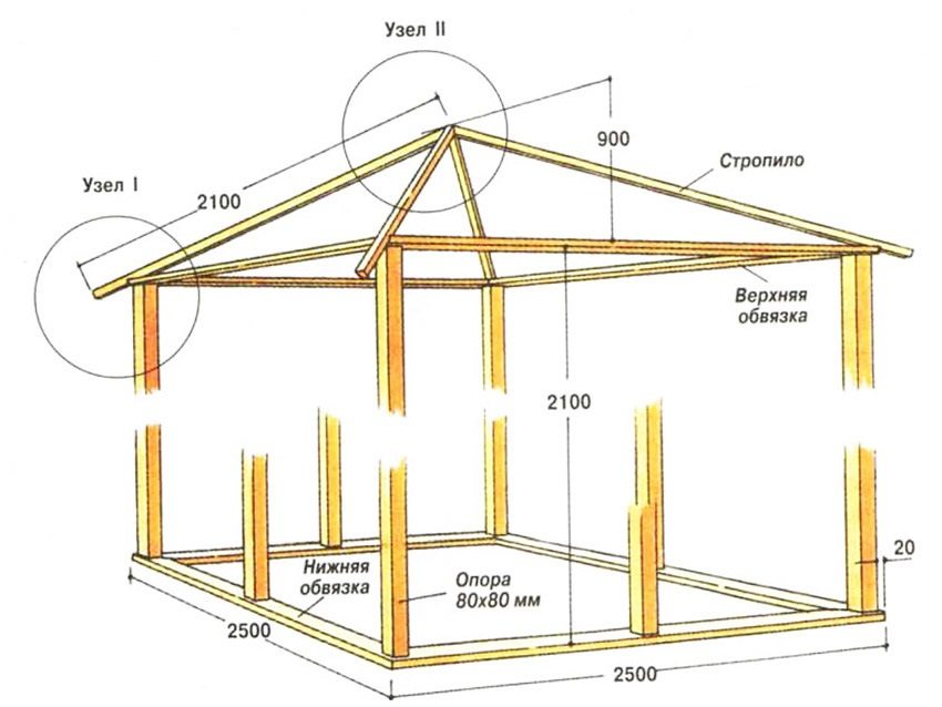- Untuk memanjangkan jangka hayat struktur pinggul, perlu menggunakan kayu lunak gergaji, pra-kering dan bebas dari kecacatan dalam bentuk simpulan dan retakan. Di samping itu, sebelum memulakan kerja, semua elemen kayu dirawat dengan sebatian antiseptik.