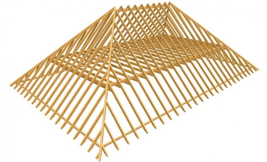 Dalam skema kasau atap pinggul, kesesuaian penggunaan kasau berlapis atau gantung, serta penggunaan elemen penguat tambahan, dibenarkan. Sekiranya selama pengiraan ternyata parameter kayu tidak sesuai dengan beban yang diperlukan, adalah mungkin untuk menggunakan balok kayu yang terpaku atau bertatahkan. Unsur-unsur yang diubahsuai ini jauh lebih besar dan boleh lebih lama.