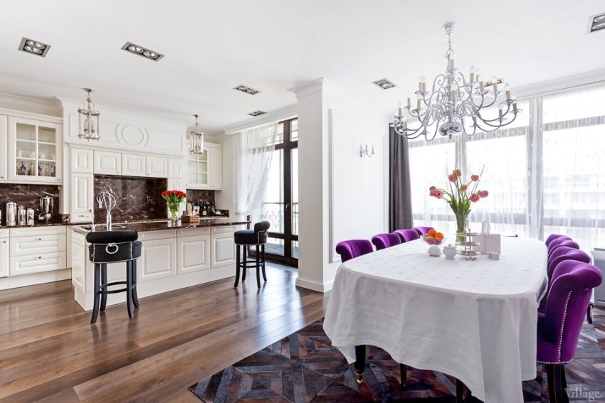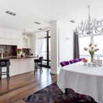 - Untuk mengimbangi reka bentuk dalaman yang megah dan elegan dengan gaya klasik, warna putih akan sangat membantu. Bahagian dalaman sedemikian akan memperoleh ciri-ciri keanggunan dan keanggunan;