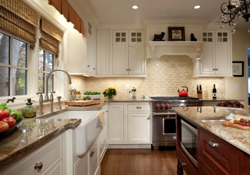 - aksen terang di apron tidak boleh dilakukan jika terdapat dapur putih sudut di dalam bilik: foto menunjukkan kombinasi fasad yang sangat baik dengan jubin tradisional, di mana corak bijaksana digunakan;