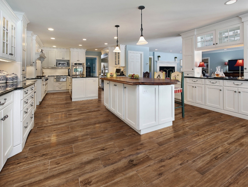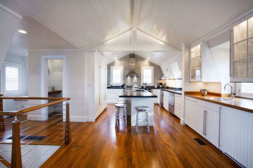 Semasa menghias lantai, mesti diingat bahawa permukaan ini bukan hanya praktikal, tetapi juga mengatur suasana untuk seluruh ruangan. Sekiranya bahagian bawahnya gelap, maka perhatian akan tertumpu pada perabot dan pelbagai perincian, termasuk pemegang dan langsir. Lantai ringan, sebaliknya, menarik perhatian kepada dirinya sendiri, jadi anda harus memilih pilihan terbaik dan harmoni. Praktis di dapur adalah jubin tahan kelembapan, linoleum, papan dek, dan juga lamina tahan haus khas.