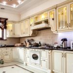 Nasihat berguna! Kabinet dapur di bahagian dalaman klasik harus sampai ke siling walaupun rak atas tidak dapat diakses. Bahagian atas fasad dihiasi dengan sudut siling. Teknik ini akan memberikan penampilan yang megah ke seluruh ruangan.