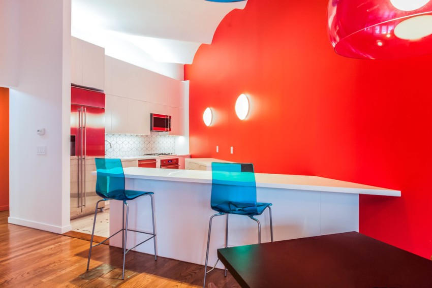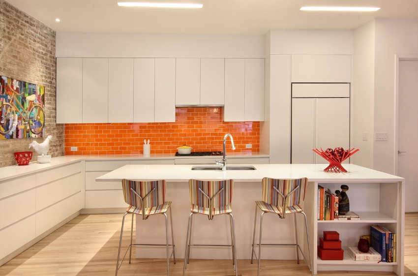 Pada masa yang sama, kelebihan warna putih di bahagian dalam dapat menimbulkan rasa kebersihan steril, yang dikaitkan dengan suasana di hospital. Masalah ini diselesaikan dengan bantuan aksesori dengan pelbagai warna dan aksen terang kecil di pedalaman. Dapur dua nada kelihatan sangat harmoni, di mana nada berbeza digunakan dalam kombinasi dengan warna putih klasik.