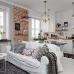 Warna pastel akan melengkapkan dalaman putih klasik dengan sempurna, bertindak sebagai latar belakang utama dalam hiasan dinding, siling atau perabot di ruang tamu, jika kita berbicara mengenai satu bilik. Warna pastel lebih khas untuk neoklasik, klasik murni adalah dinding dan siling putih salji. Unsur-unsur hiasan mungkin mengandungi warna batu semula jadi yang berbeza, yang sangat sesuai dengan klasik dapur putih. Foto menunjukkan pilihan untuk reka bentuk dalaman dengan tiruan batu semula jadi di atas meja atau di lantai.