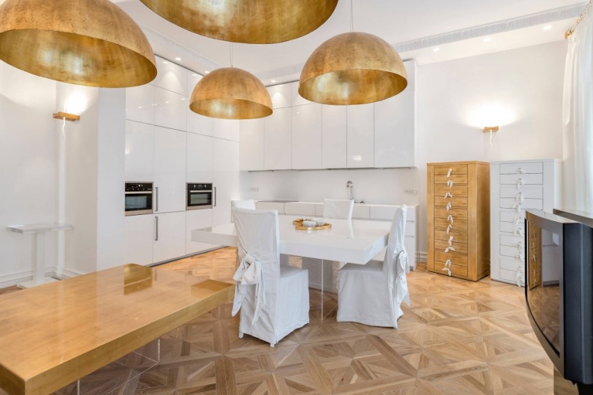 - Produk-produk matte di bahagian dalam dapur putih yang kerap sering dilakukan dengan kemasan yang disepuh, yang memberi ruang dan keseriusan di bilik. Langsir, barang-barang ruang makan dan aksesori boleh berwarna putih atau berlapis emas.