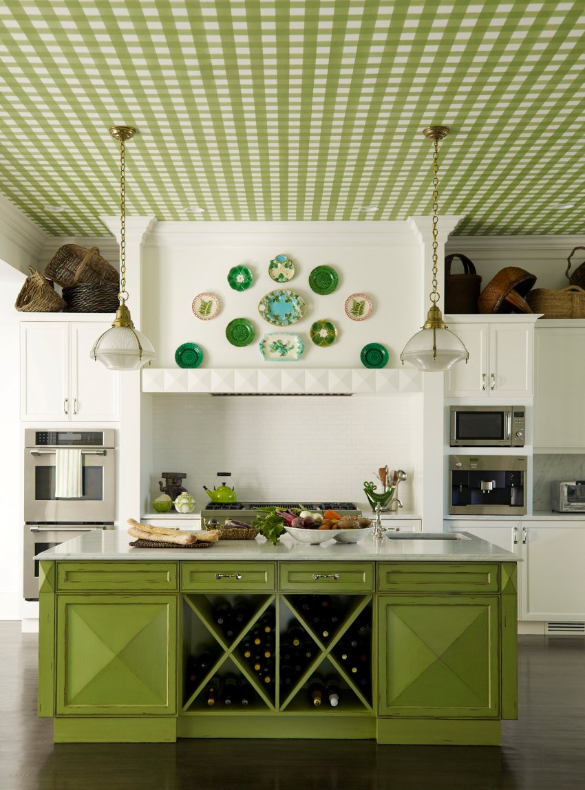 - corak lantai seperti podium atau jubin seramik hiasan yang membentuk garis besar dapur atau kawasan berfungsi;