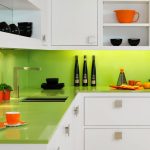 Perhatian khusus diberikan kepada reka bentuk apron. Dia menetapkan suasana untuk seluruh kawasan kerja, bergantung padanya apa ruangan itu: mewujudkan kesederhanaan dan genius atau mewujudkan misteri futuristik. Pilihan yang bagus untuk apron adalah permukaan kaca (kulit), yang akan membantu merealisasikan idea. Mereka sering mengandungi pemandangan alam atau kota pada waktu malam, gambar burung, buah-buahan, atau potret yang berwarna-warni.