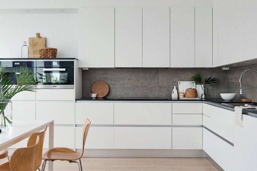 - di dapur putih moden, kombinasi fasad putih dengan perkakas rumah berwarna gelap sesuai, tetapi dengan syarat terdapat perincian reka bentuk lain dengan warna yang sama di bahagian dalam: langsir, hiasan dinding atau perabot di ruang makan, serta perkakas dan bahkan bahagian fasad, tetapi secara eksklusif alat dengar di bahagian bawah.