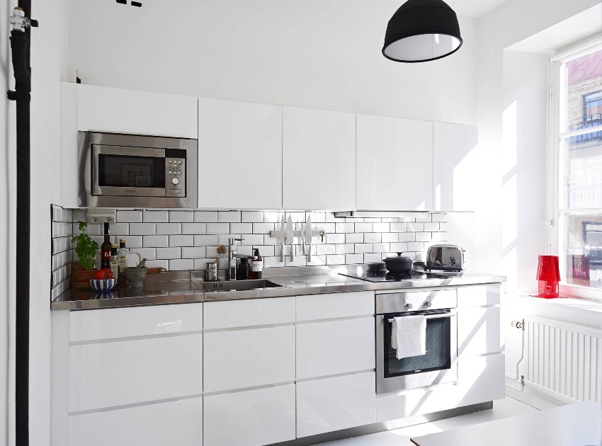 Nasihat berguna! Dapur putih berkilat adalah cara terbaik untuk mengembangkan dapur kecil secara visual dan menambah cahaya ke bilik yang menghadap ke utara.