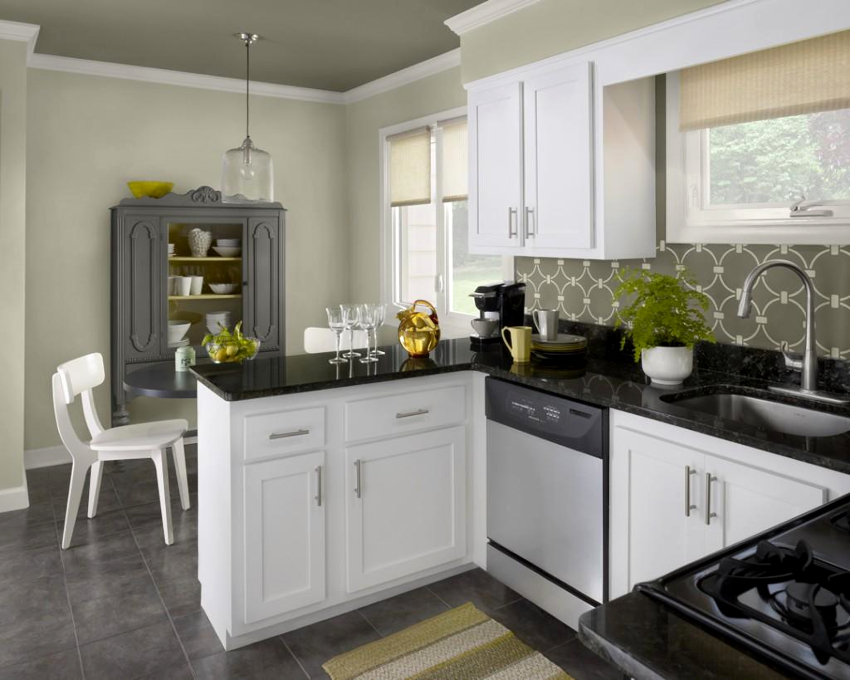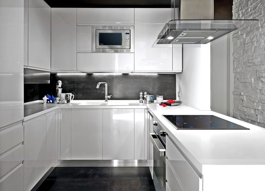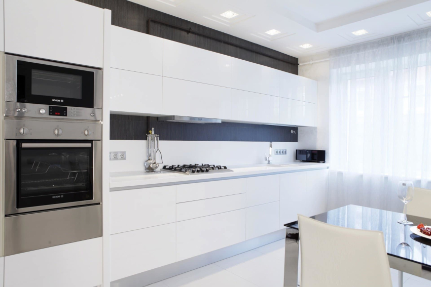 Putih betul dianggap universal dalam reka bentuk dalaman. Ini adalah simbol kebersihan, kesegaran dan sumber pantulan cahaya di dalam bilik, oleh itu ia sering digunakan dalam membuat reka bentuk dapur. Menggabungkan warna putih dengan warna lain, terutama hitam, sudah menjadi percubaan berani yang memerlukan pendekatan yang betul dan kompeten baik dalam pemilihan warna dan dalam pilihan perabot, bahan dan hiasan. Kehadiran gelap dan terang harus seimbang.