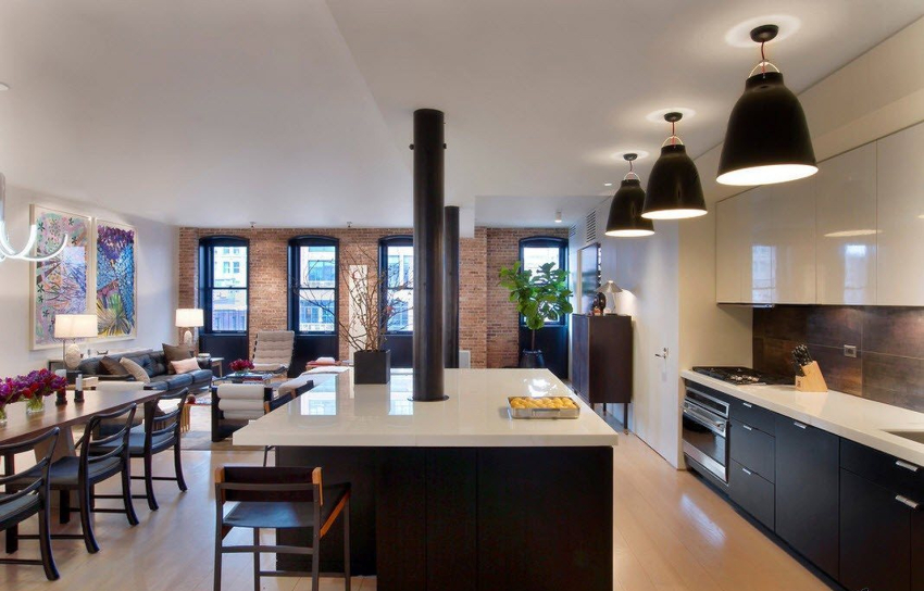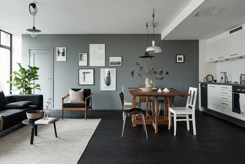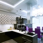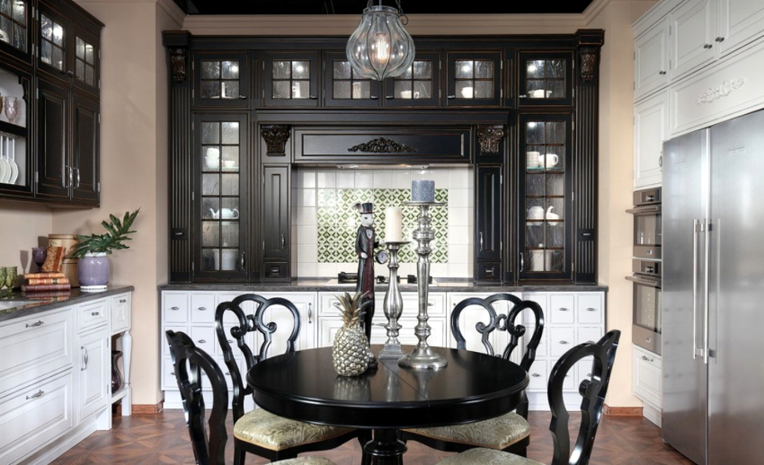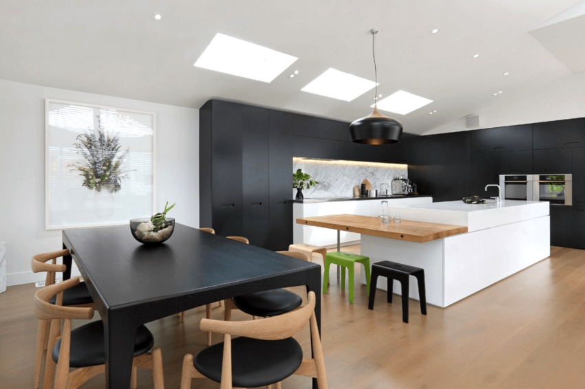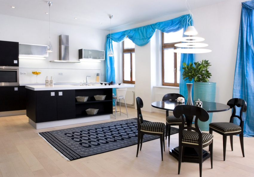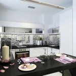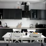 Dapur hitam dengan warna putih akan kelihatan selesa di apartmen studio yang luas. Foto bilik putih dengan ruang makan berwarna hitam juga kelihatan sangat menarik. Aksen yang terang boleh menjadi meja hitam itu sendiri dan digabungkan dengan pelbagai barang hiasan dalam bentuk serbet, pinggan mangkuk, peralatan dan pelbagai komposisi.
