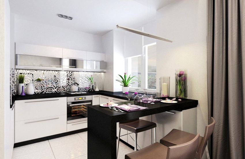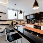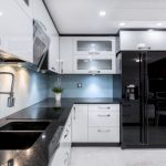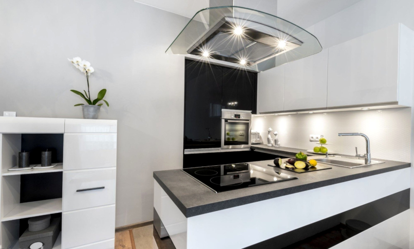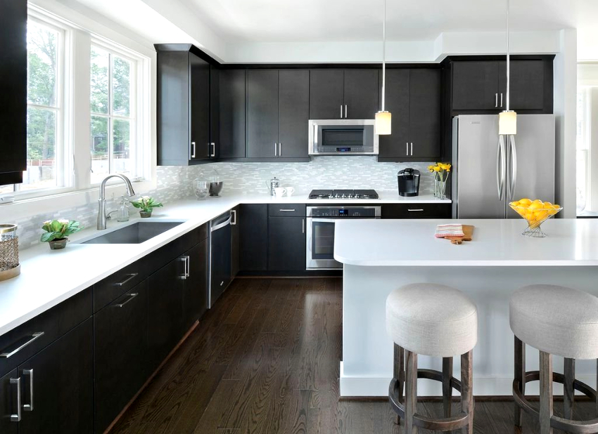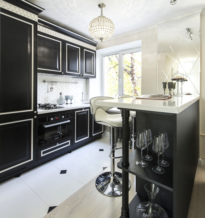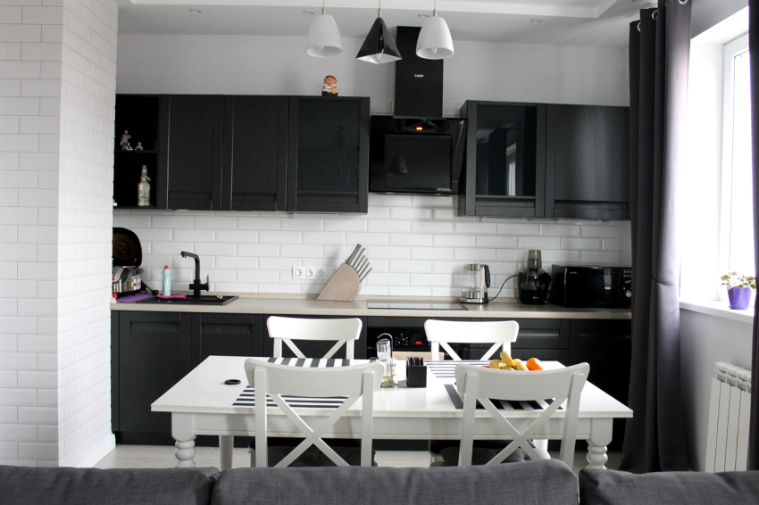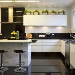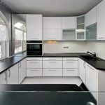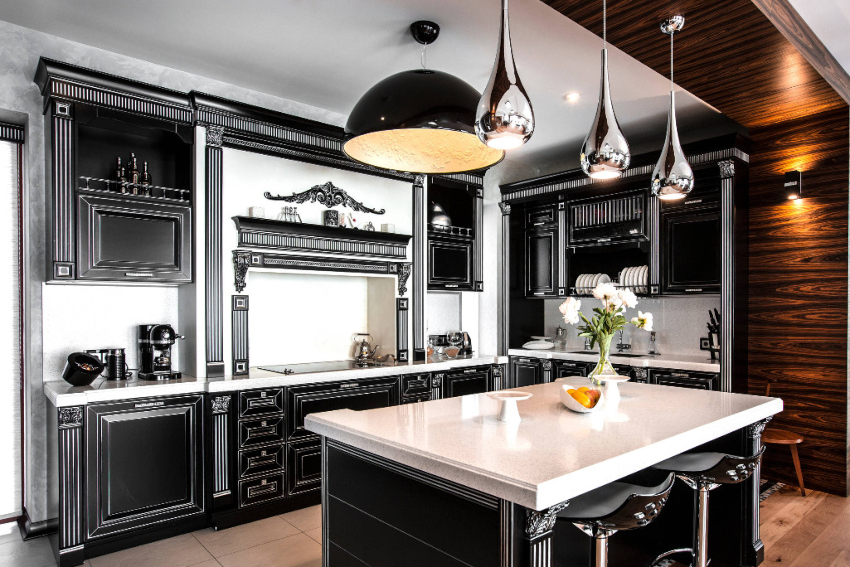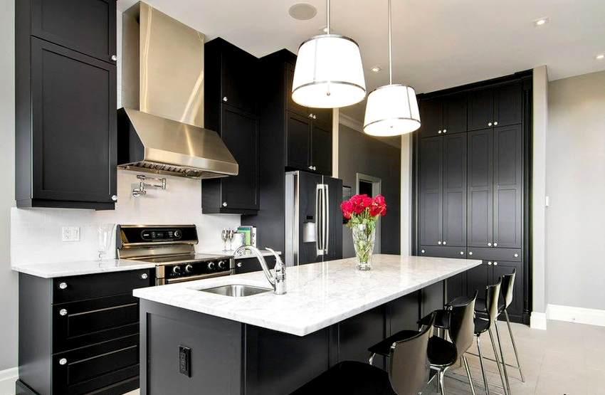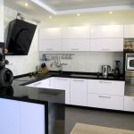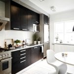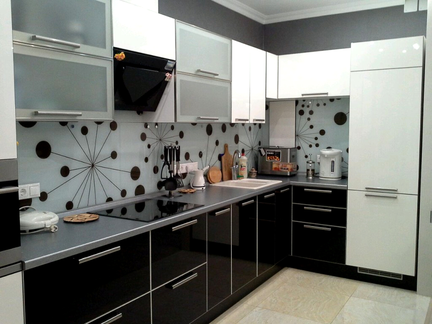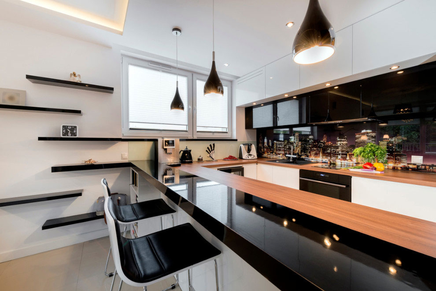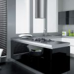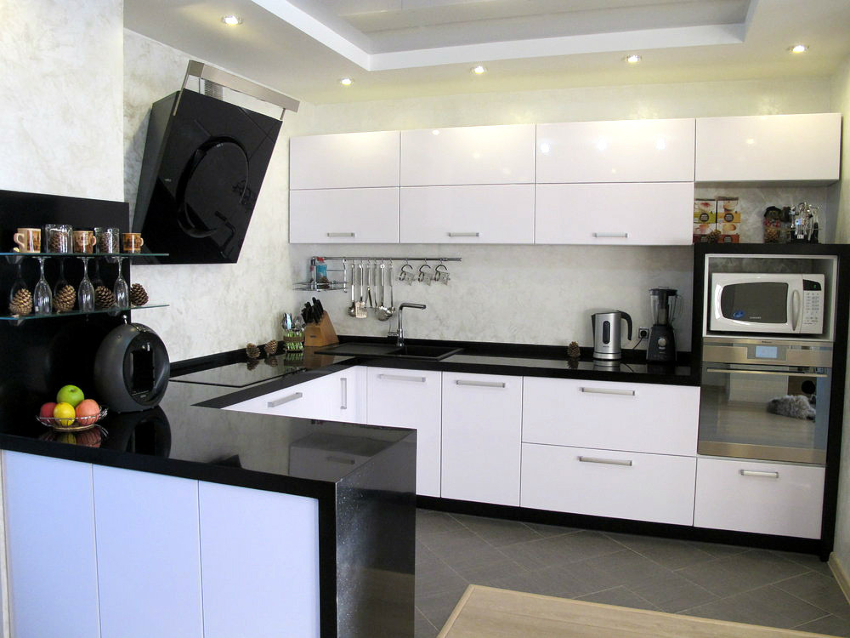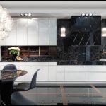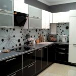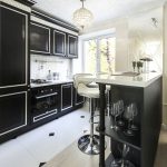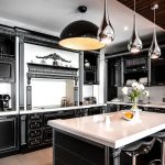 Kemewahan dan kepraktisan kilauan dapur hitam putih: gambar idea yang berjaya dilaksanakan