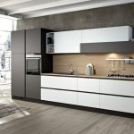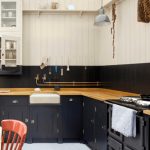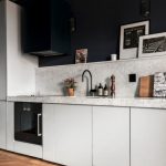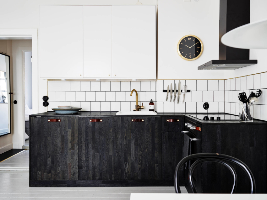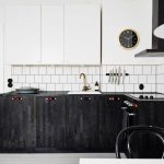 - dapur hitam dengan aksen putih adalah pilihan yang agak berisiko dan tidak terlalu praktikal bagi pencinta nada gelap dalam segala hal, kerana pencemaran dapat dilihat pada kilauan hitam pada bahagian muka lebih daripada pada latar belakang putih.