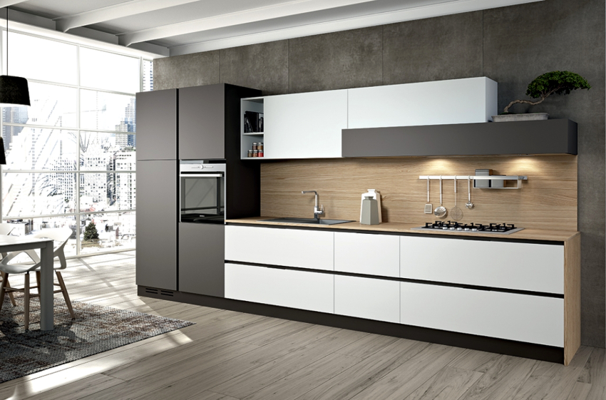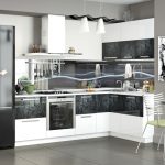 Kategori khas set dapur hitam dan putih diwakili oleh model dengan fasad campuran yang disusun dalam corak papan catur. Blok elemen hitam di bahagian atas putih atau pintu putih di bahagian bawah kit kelihatan menarik.