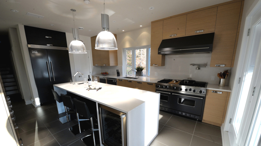 - Pelbagai objek kaca kelihatan secara organik di dapur seperti, misalnya, meja, fasad atau kulit di apron.