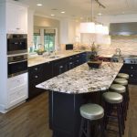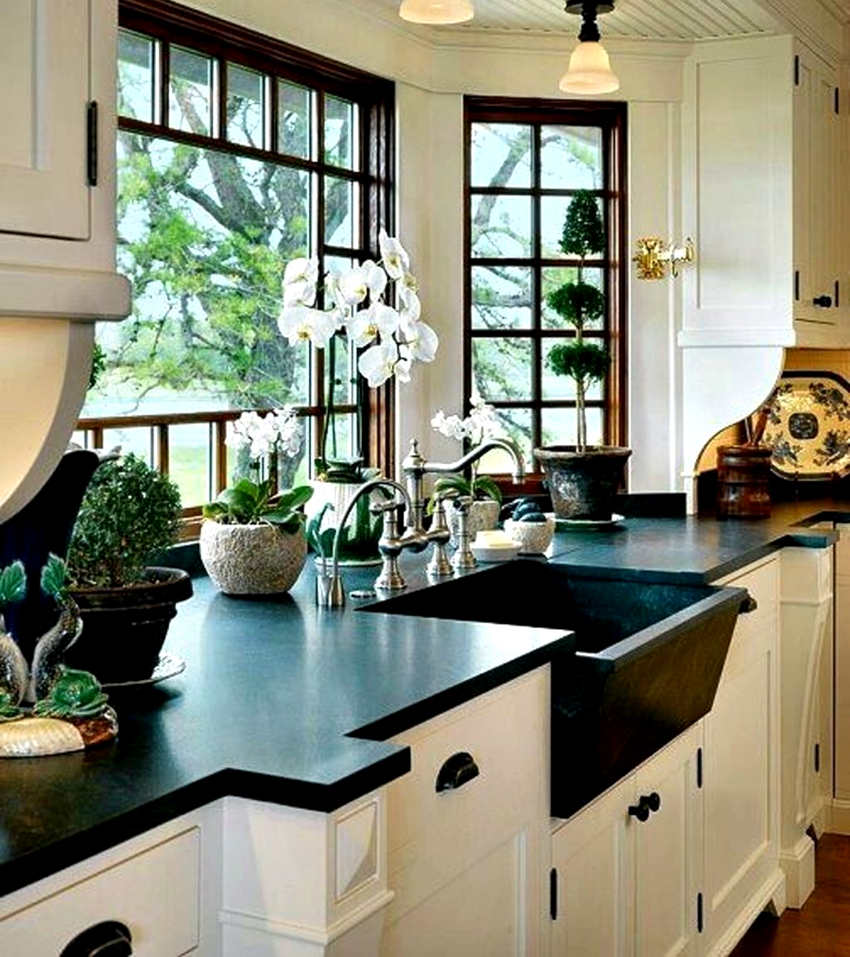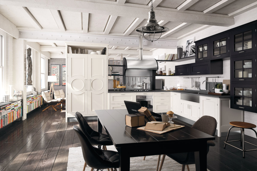 Anda boleh memilih dari beberapa pilihan seperti dapur putih dengan perkakas hitam atau bahagian depan cahaya yang digabungkan dengan apron gelap atau meja kerja. Alat dengar dengan bahagian atas putih dan bahagian bawah hitam sangat menarik. Perabot putih di dapur dengan hiasan hitam kelihatan sangat padat dan mewah. Pilihan ini juga sangat praktikal. Perabot hitam dan putih, selain daya tarikan khasnya, harus sesuai dengan keseluruhan bahagian dalam dapur.