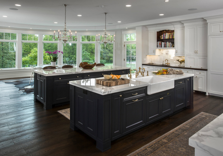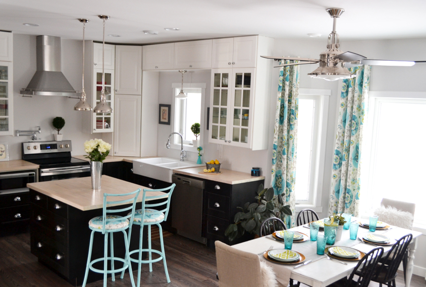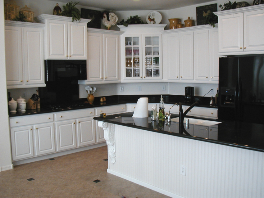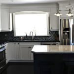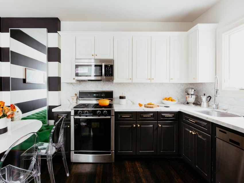 Bahagian bawah putih - bahagian atas hitam, dapur putih dengan peralatan hitam dan pilihan reka bentuk lain