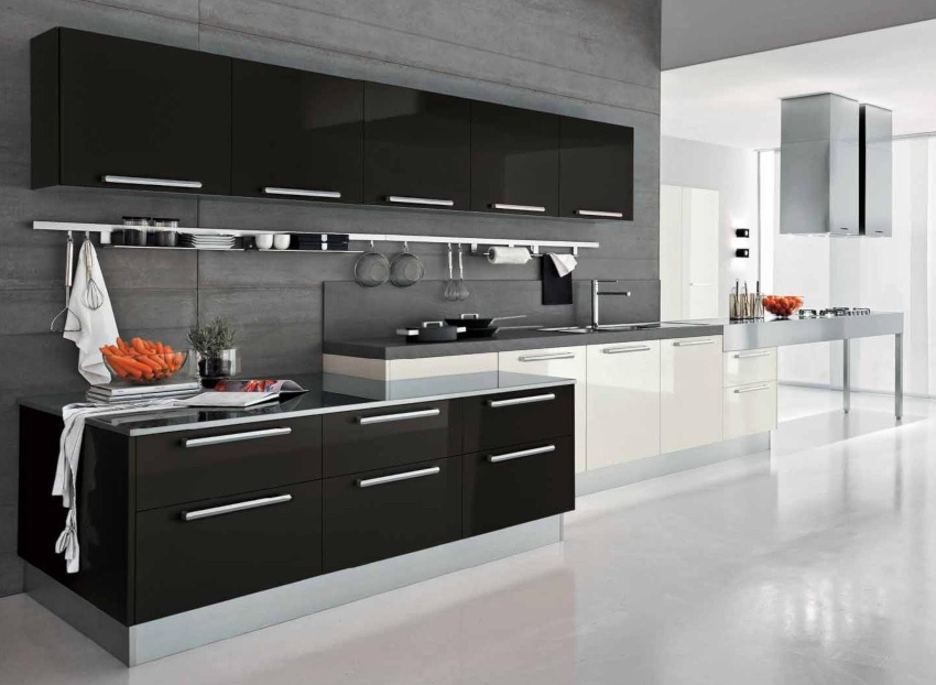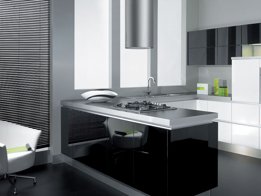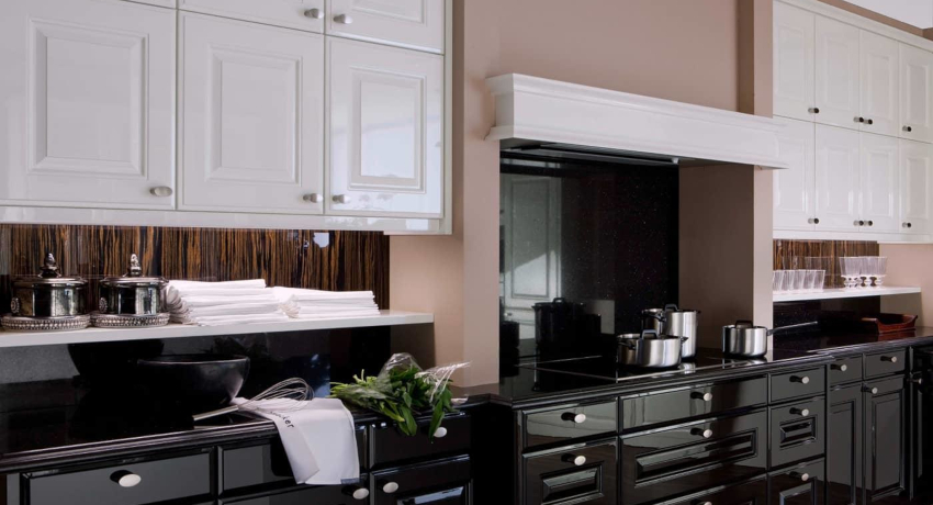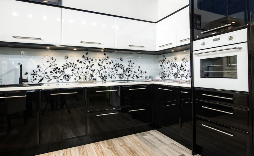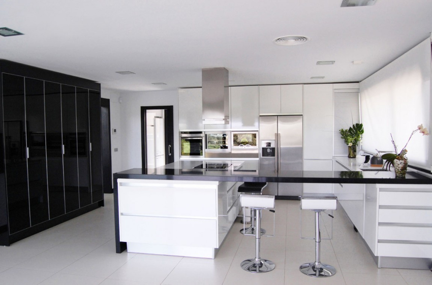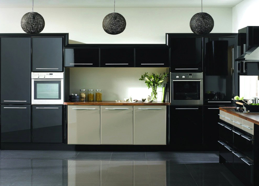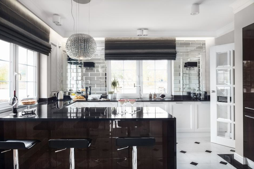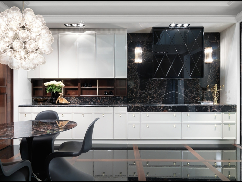 Dalam pelbagai ruang dalaman bergaya yang dihiasi dengan warna yang kontras, dapur berkilat hitam dan putih, di mana keanggunan digabungkan dengan keindahan semula jadi, layak mendapat telapak tangan, yang membolehkan anda menerapkan sebarang penyelesaian gaya, sama ada klasik, retro, minimalis atau art deco.