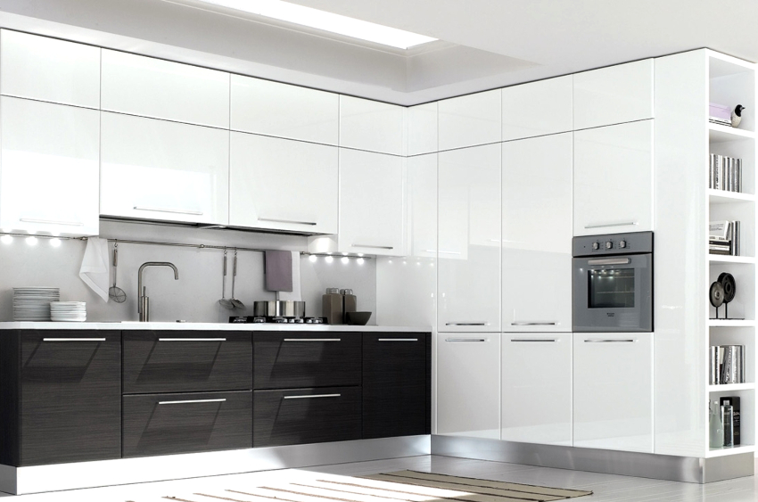 Nasihat berguna! Almari pakaian terpasang walaupun berwarna hitam di dapur hitam dan putih berkilat, berkat permukaan yang berkilat, dapat memperluas ruang secara visual.