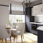 - bahagian bawah hitam yang digabungkan dengan bahagian atas cahaya adalah pilihan paling popular yang digunakan pereka secara aktif di dapur kecil;