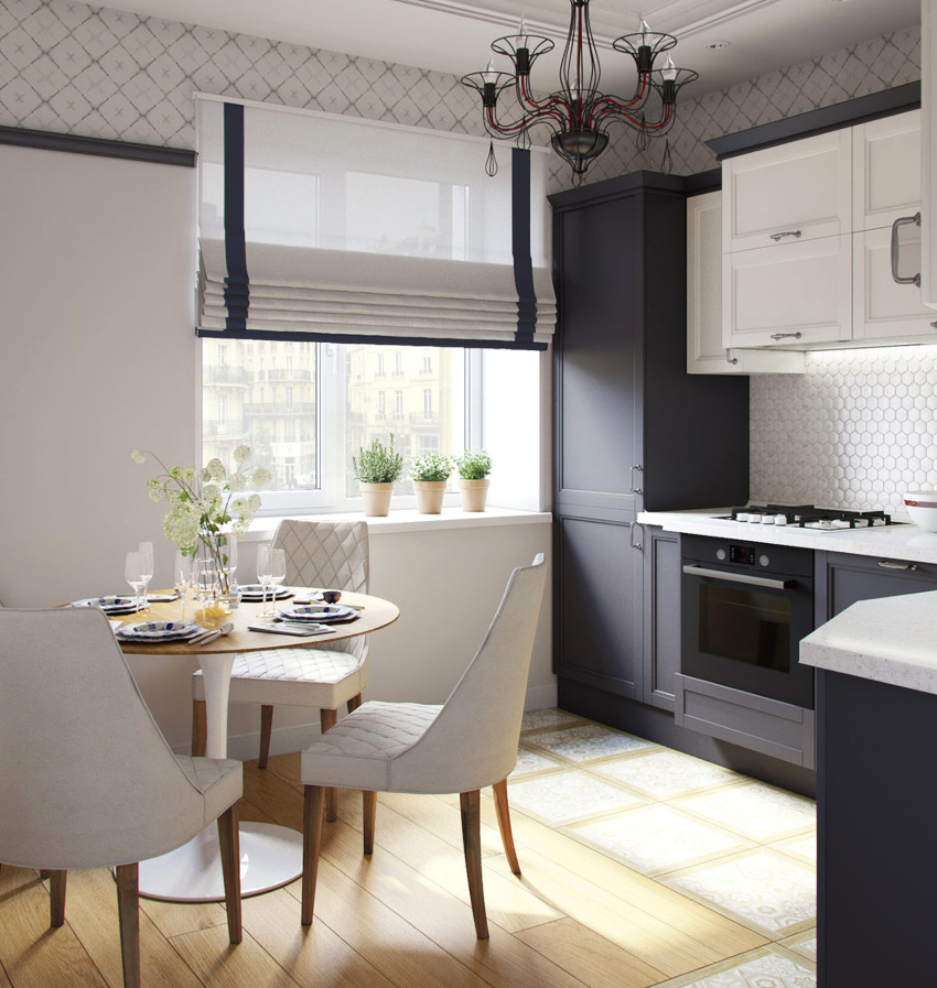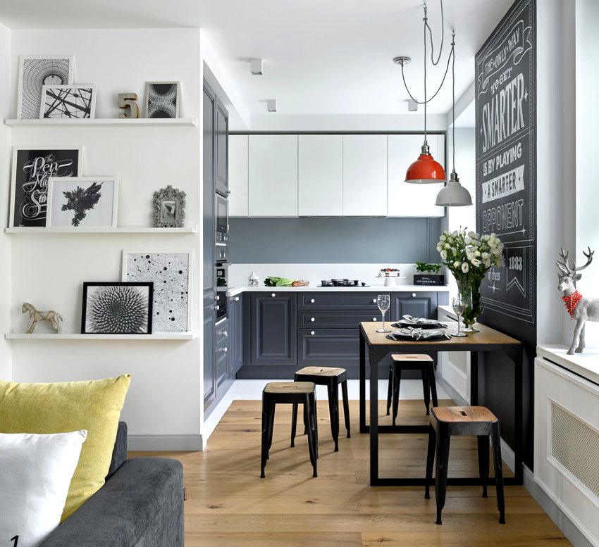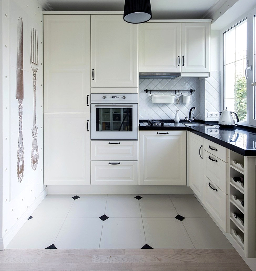 Nasihat berguna! Di dapur hitam dan putih kecil, warna putih harus diutamakan, yang memperbesar ruang secara visual.