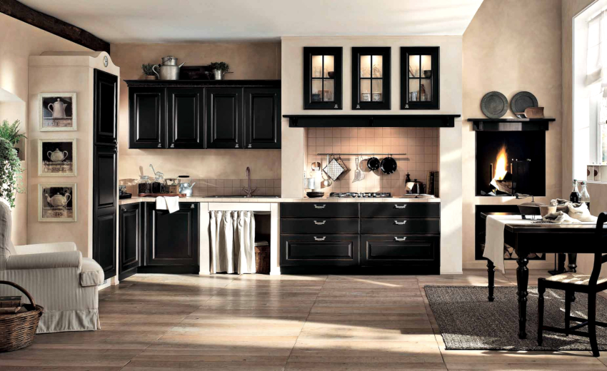 Selamatkan keadaan di dapur hitam permukaan berkilat yang meningkatkan ruang secara visual kerana kekhususan. Di pangsapuri bersaiz kecil, lebih baik bertaruh dengan warna terang di pedalaman, dan warna hitam harus digunakan dalam bentuk dos - dalam bentuk aksen dan perincian hiasan. Sebagai contoh, dapur putih kelihatan hebat digabungkan dengan peralatan hitam atau lantai hitam, yang memberikan penampilan yang terhormat ke bilik. Terlepas dari jumlah perabot, bilik akan kelihatan kaya. Reka bentuk sedemikian, menurut ahli psikologi, sangat selesa bagi seseorang, kerana ia menimbulkan rasa kesucian.