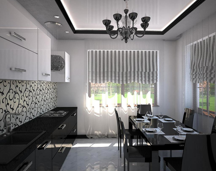 Langsir untuk dapur hitam dan putih: pilihan warna dalam pelbagai gaya