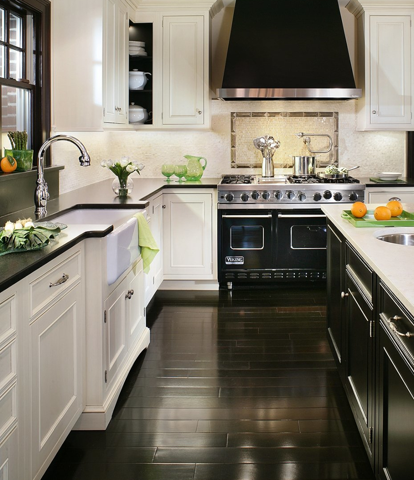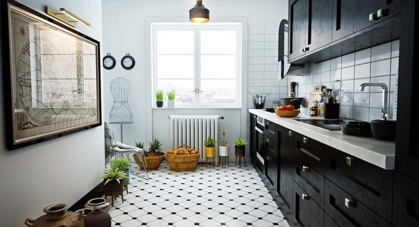 Reka bentuk dapur hitam dan putih: ciri hiasan dinding, lantai dan siling