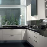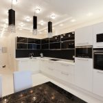 Dapur sudut, dibuat dalam gaya hitam dan putih, perlu mendapat perhatian khusus, kerana ia merupakan perwujudan moden dan klasik yang berjaya. Reka bentuk ini sangat sesuai dengan bahagian dalaman mana pun, kerana warna-warna ini selalu mengikut trend. Sebilangan besar dapur ini dibuat khas menggunakan elemen reka bentuk khas dan asli. Selalunya dilengkapi dengan portal khas, ceruk dan rak terbina dalam.