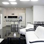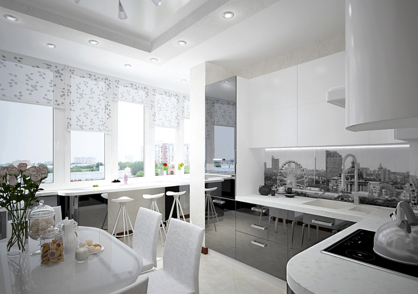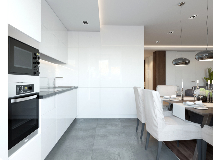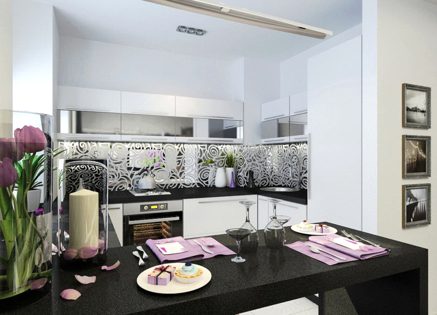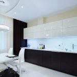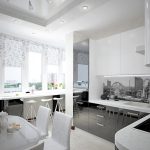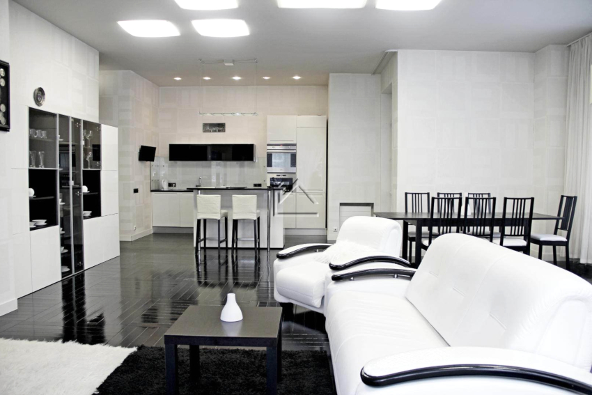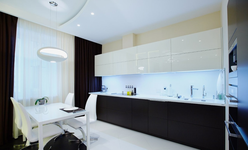 Pilihan reka bentuknya kelihatan hebat, di mana alat dengar dan perkakas rumah dibuat dengan warna hitam gloss, dan ruang makan berwarna putih bersih. Dapur dengan meja kerja berkilat hitam selaras dengan kerusi putih juga mempunyai penampilan yang bergaya. Pilihan dapur monokrom berkilat sangat sesuai untuk orang yang bermimpi kehilangan beberapa kilogram, kerana warna ini tidak merangsang selera makan. Oleh itu, reka bentuk dalam warna hitam dan putih akan sangat penting bagi mereka yang bermimpi menurunkan berat badan.