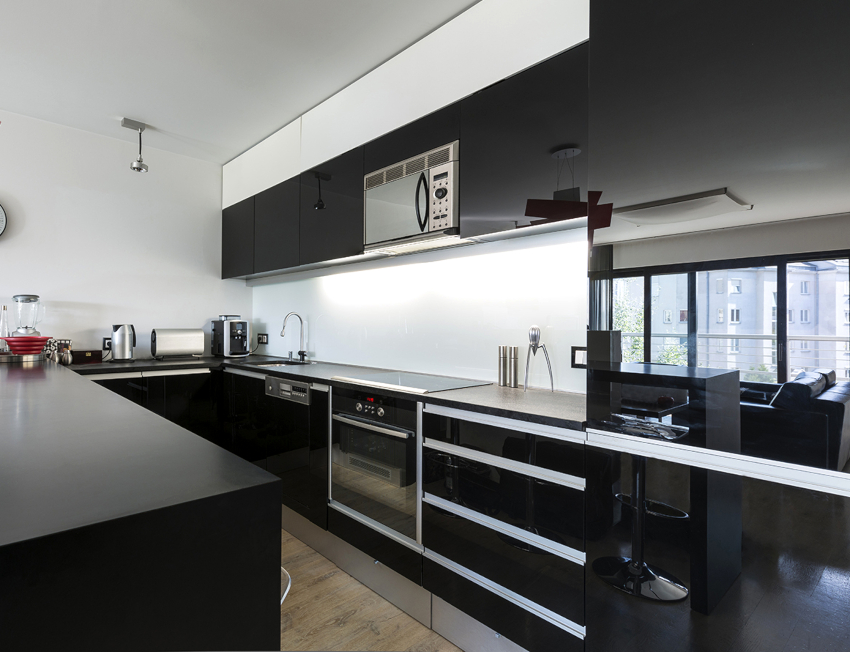 - Papan MDF dengan lapisan akrilik atau enamel. Alat dengar sedemikian kelihatan sangat mengagumkan dan padat, termasuk dalam gaya moden. Kilauan dapur hitam-putih, bersinar memancar, mampu menambahkan kelantangan dan kedalaman ke ruang. Pada masa yang sama, lapisan seperti itu mahal, mudah merosakkannya, dan calar dan juga cap jari di atasnya sangat ketara, terutama dengan latar belakang hitam.