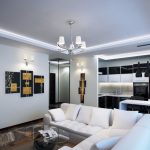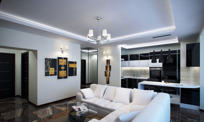Pencahayaan memainkan peranan penting pada bahagian dalam hitam dan putih dengan kesan berkilat. Pengaturannya yang betul, yang melibatkan pencahayaan perabot dan penggunaan lampu terang di tempat kerja dan ruang makan, akan membantu mengubah seluruh ruangan.