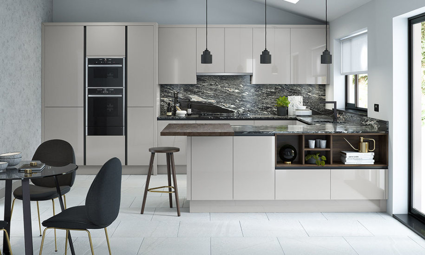 - Kelabu adalah sintesis putih dan hitam, jadi kehadirannya di pedalaman akan membantu mempelbagaikan dapur sedikit dan meneutralkan kontras.