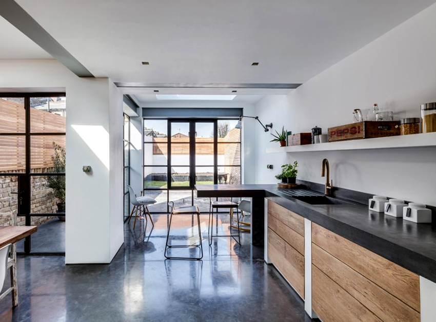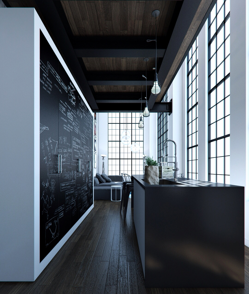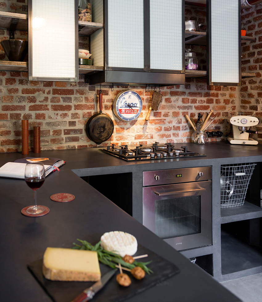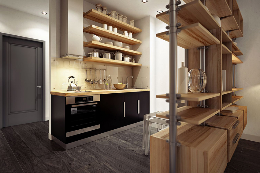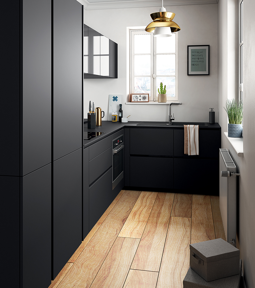 - Bahagian dalam dapur hitam adalah kontras warna, yang menimbulkan misteri dan semacam drama.