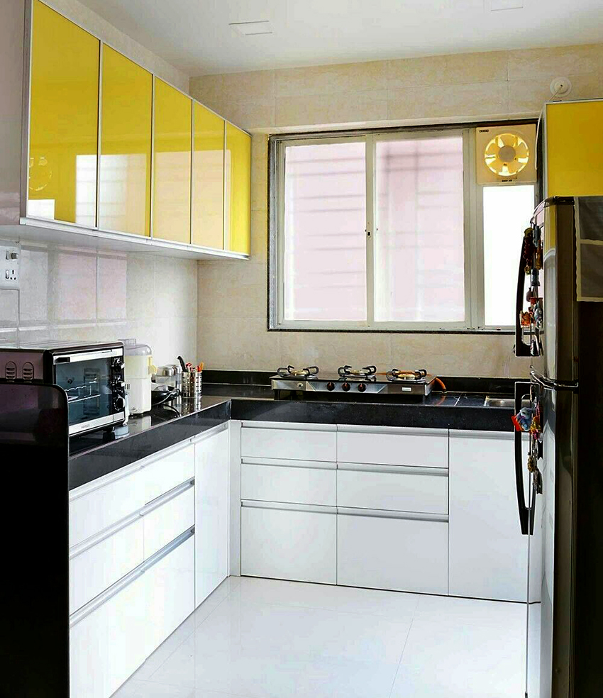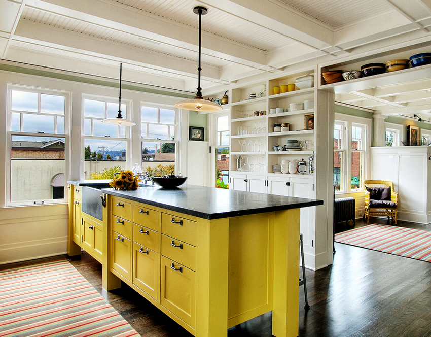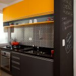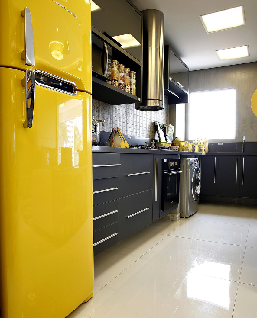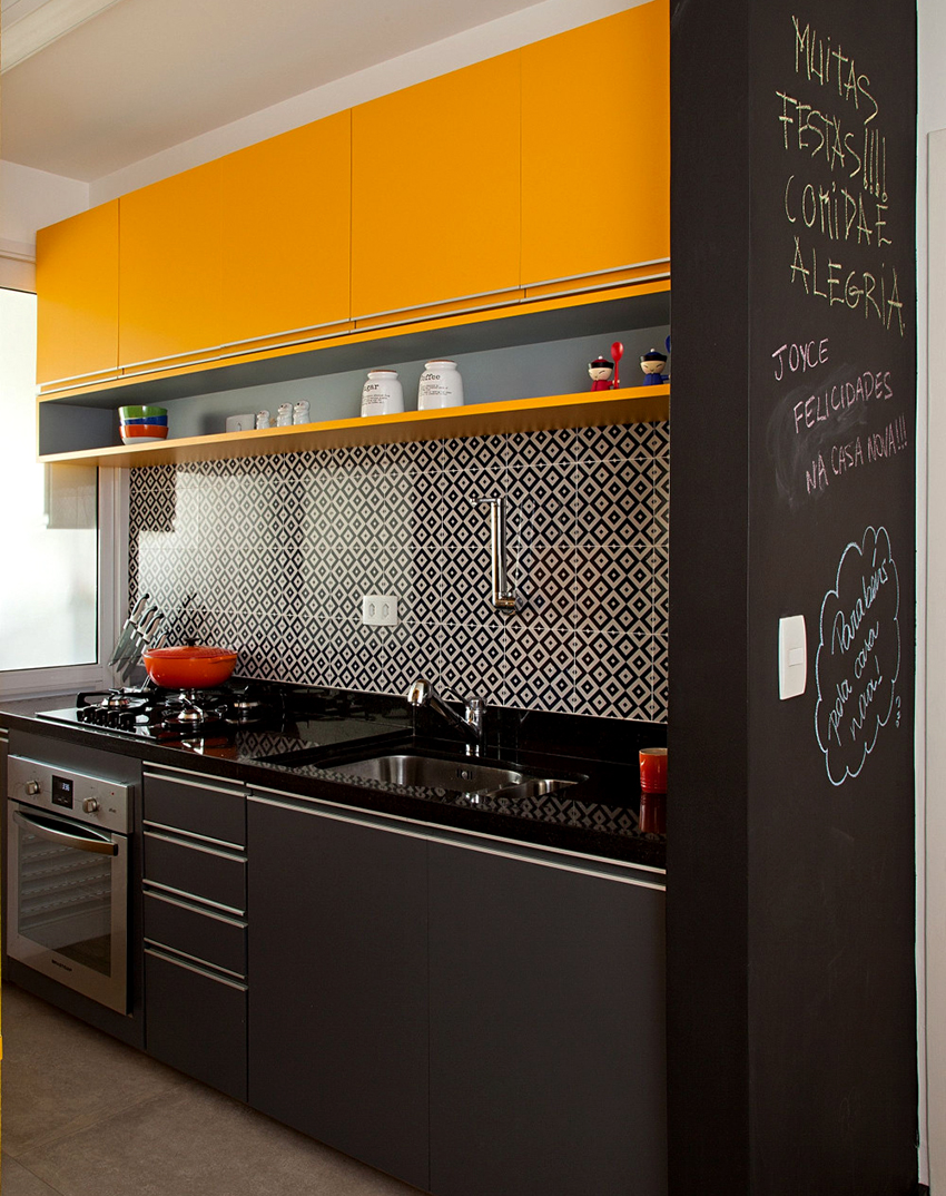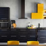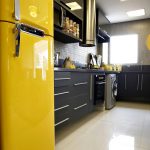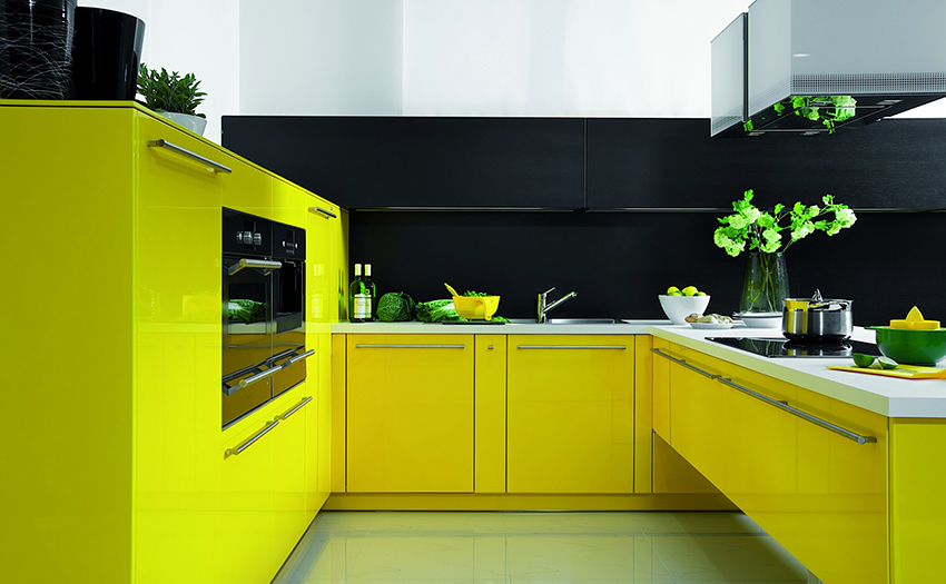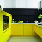 Hitam-dapur kuning Merupakan gabungan dua nada yang kaya dan kuat. Kuning yang halus dan cerah memberikan kelazatan dan mewujudkan kontras emosi dengan warna hitam pekat. Oleh itu, bahagian dalaman dapur yang ekspresif dan tegas, menggabungkan lawan, membawa sentuhan yang ceria dan mewujudkan suasana yang cerah.