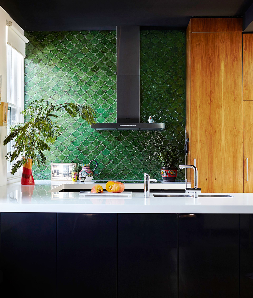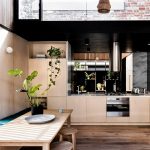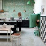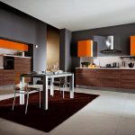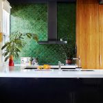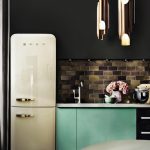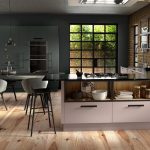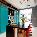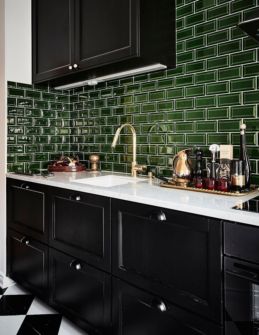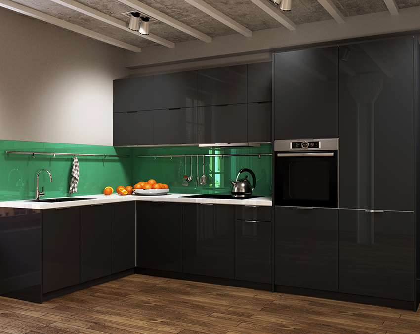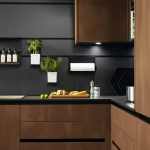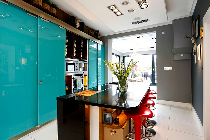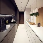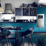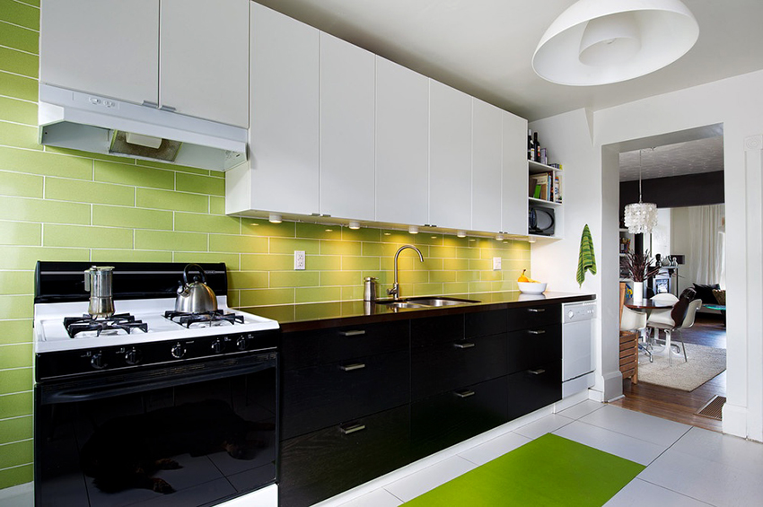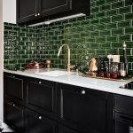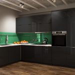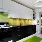 Di dapur hitam dan hijau, warna tenang dan mewah menambah ruang secara visual, mewujudkan kedalaman semula jadi dan suasana yang hebat. Kombinasi ini kelihatan baik selaras dengan perincian keluli dan kaca buram. Dapur yang dihiasi dengan warna yang kontras, di mana warna hitam digabungkan dengan warna yang terang, sangat moden, tidak standard, minimalis dan selesa mendominasi reka bentuknya.