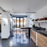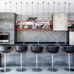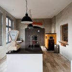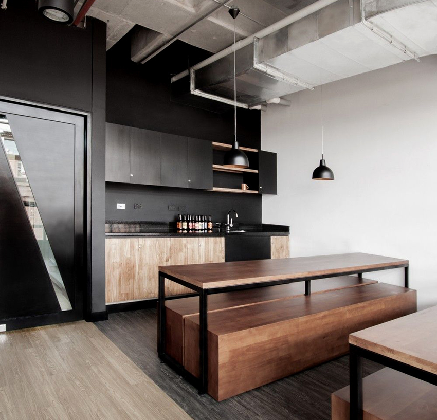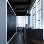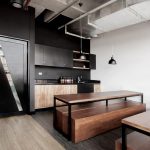 Dapur hitam dan kuning air membantu melembutkan kegelapan gelap, mewujudkan suasana selesa di kedai kopi yang canggih. Penambahan dari kain dan bahan semula jadi akan sesuai dengan bahagian dalaman seperti itu. Hasilnya adalah persekitaran moden dan semula jadi.