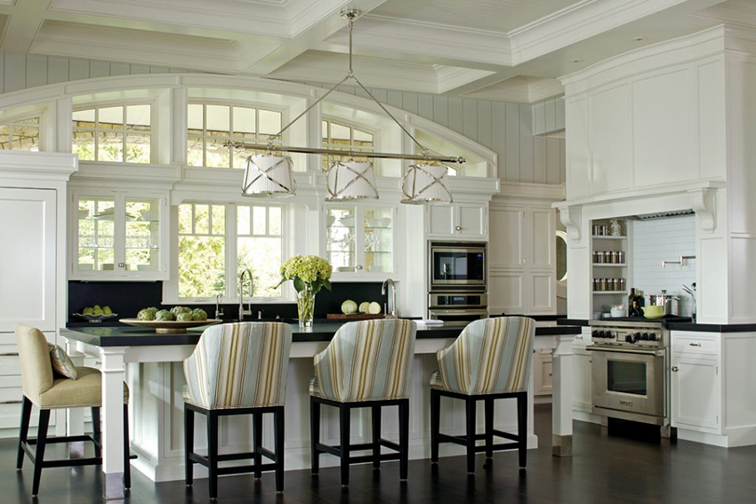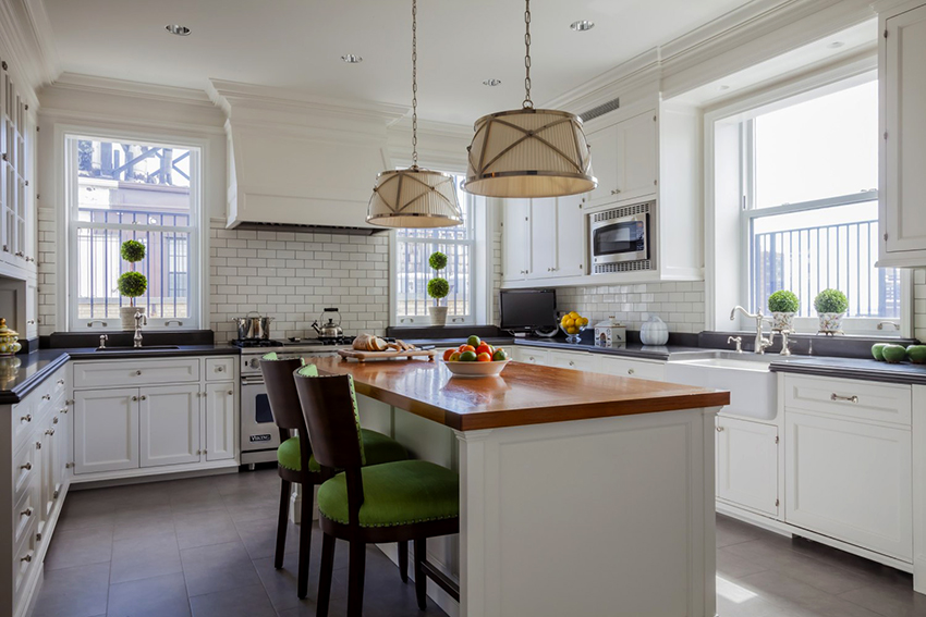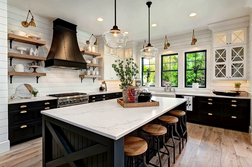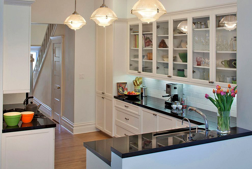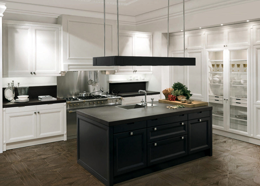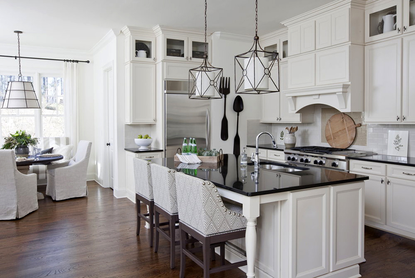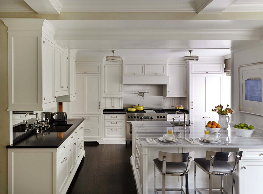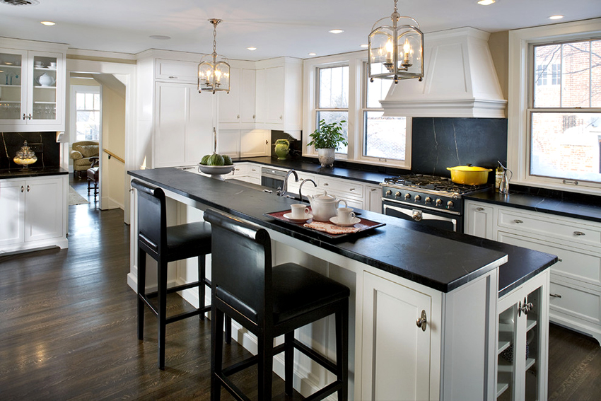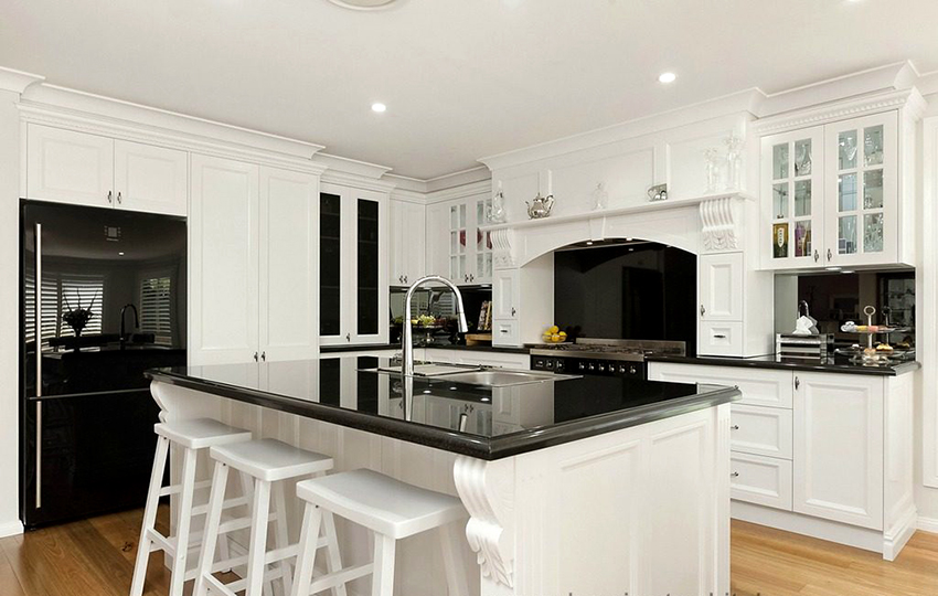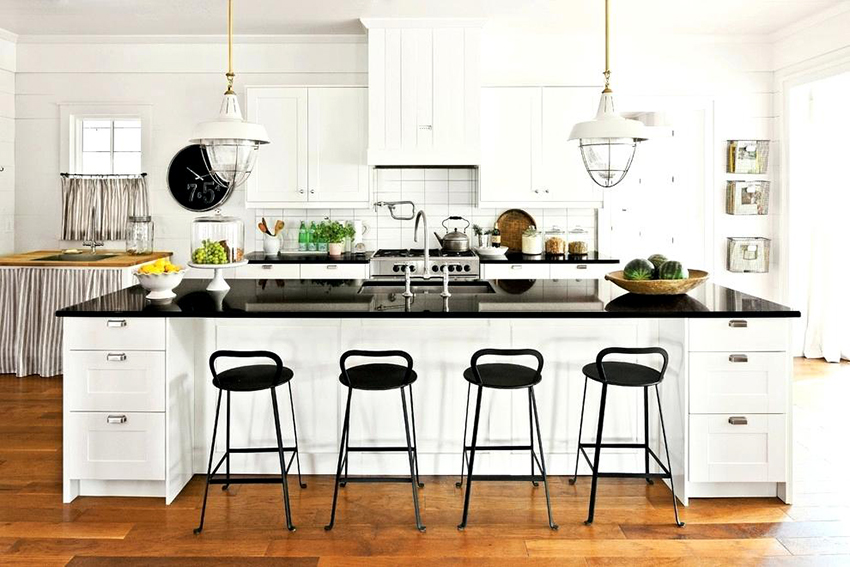 Gabungan dapur putih dan meja hitam kelihatan paling menguntungkan dalam gaya klasik moden